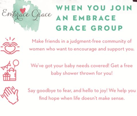 Embrace Grace is a small group experience designed to provide emotional, physical, and spiritual support, encouragement, and friendship to young, single women experiencing a pregnancy. This 12 week program teaches about God's love and grace, and at the end of the program, the church gives each young lady a baby shower to honor them for choosing life and to help provide for their baby's needs.